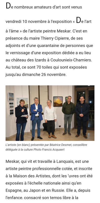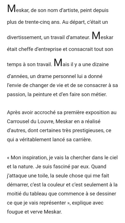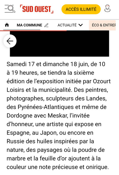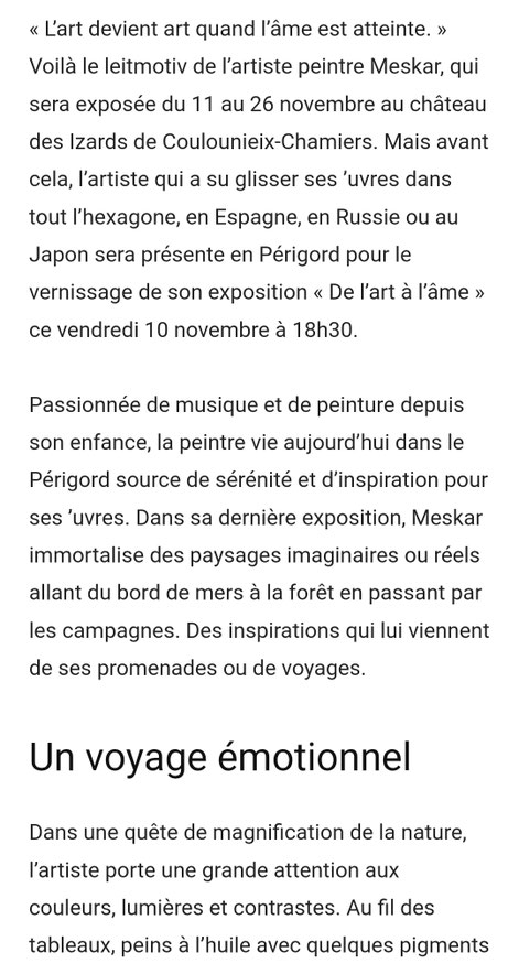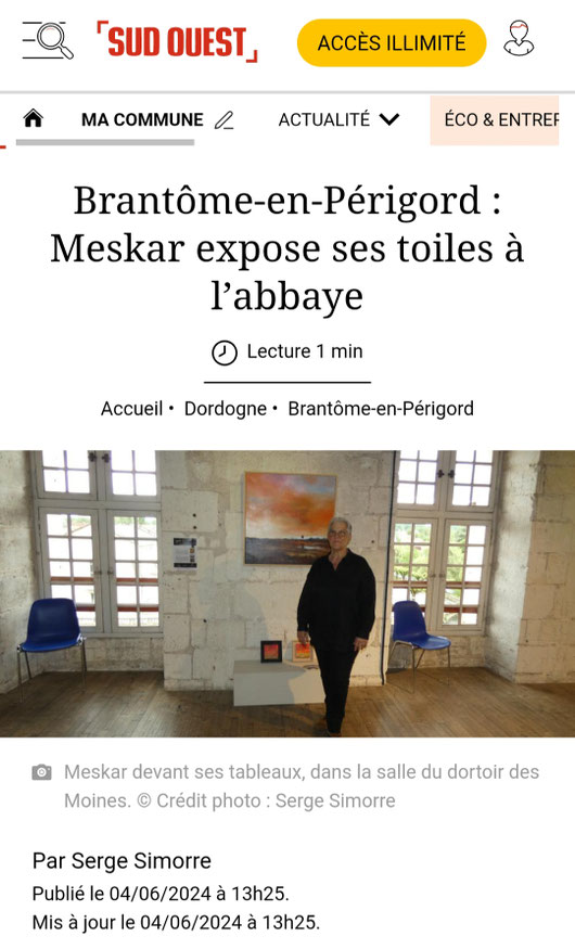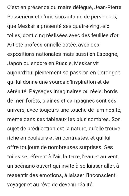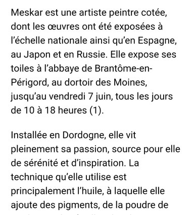 Chaque jour, « DL » met à l’honneur une personnalité dont c’est l’anniversaire et qui fait le point sur ses activités, ses engagements ou son entreprise. Aujourd’hui, « DL » souhaite un bon anniversaire à Meskar, peintre installée en Dordogne. Elle souffle, ce jeudi 5 juin, ses 65 bougies.