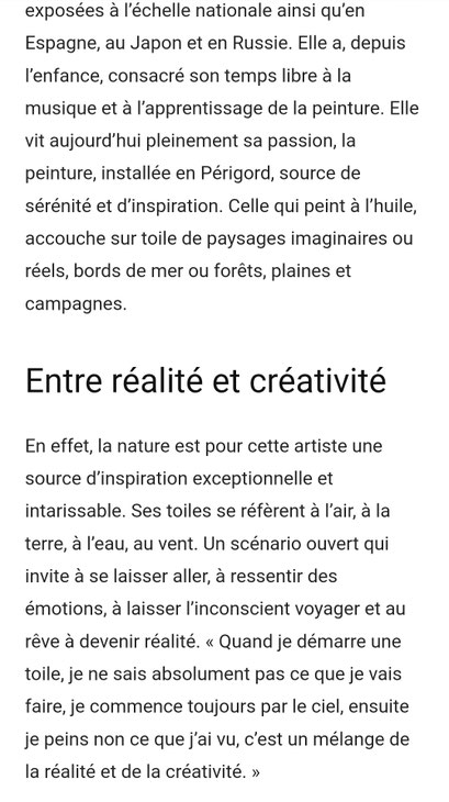 Il y a, dans mes peintures, 50 % de réalité et 50 % d’imaginaire. Je peins dans mon atelier, souvent trois ou quatre toiles en même temps, mais c’est l’extérieur, la nature, qui m’inspire. Je suis une "éponge à ambiances" et je me fais souvent happer. Mon regard se pose, je m’arrête et je contemple. Inconsciemment, cela s'enregistre dans un coin de ma tête, et une fois la peinture terminée, je fais des connexions avec ce que j’ai pu croiser, admirer.