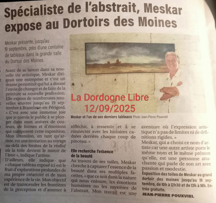 Après quinze jours à Tours et un mois dans les Landes, j’exposerai à Brantôme pendant quinze jours au Dortoir des Moines. C’est une salle que je connais déjà et où je peux exposer divers formats (du plus petit au plus grand). J’aime que l’art soit accessible à tous, et les petits formats le permettent. Du 6 au 19 septembre 2025, j’y exposerai près de 80 oeuvres.
